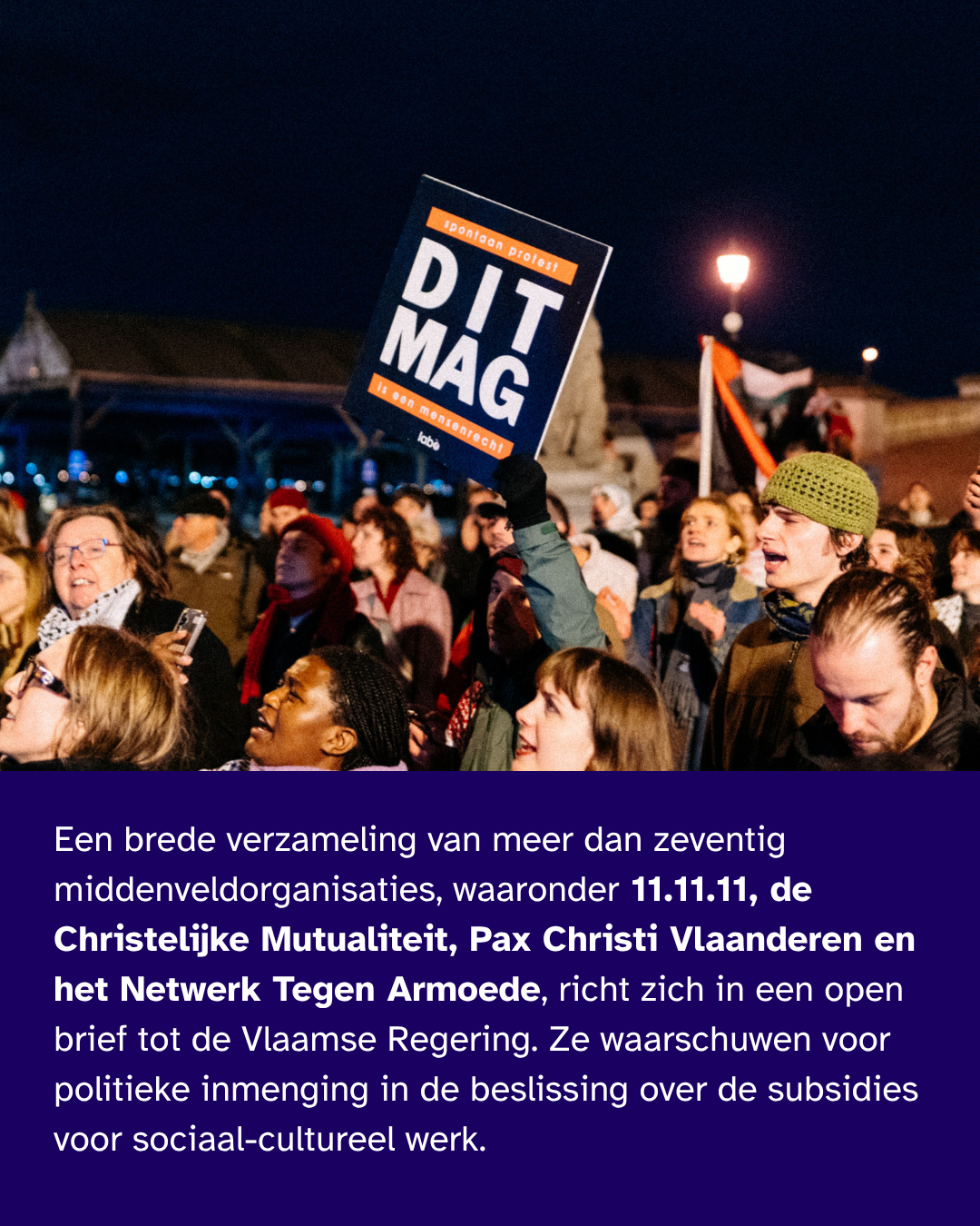 Wij vragen dat de Vlaamse Regering haar eigen regels respecteert, en de geest van haar eigen decreet bewaakt. Dat de vrijheid van meningsuiting en de ruimte voor verzet beschermd blijven.76 middenveldorganisaties in een open brief